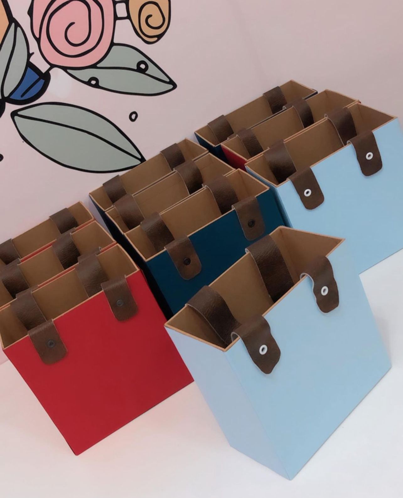 Confeccionada em cartonagem e forração em papel adesivo laminação fosco na parte externa e na parte interna adesivo off sem laminação, a alça em material couro sintético.